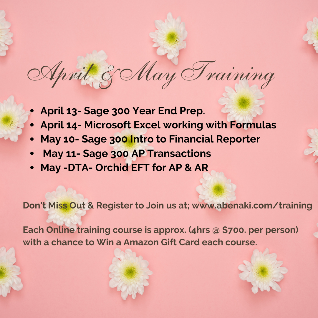 New April & May Webinars! Amy Young April 12, 2022Abenaki News, Online Training Online training available now for Sage 300, Orchid EFT and Excel this Spring. Don’t miss out and register today! Give us a call if you have any questions at 1-800-361-1402.