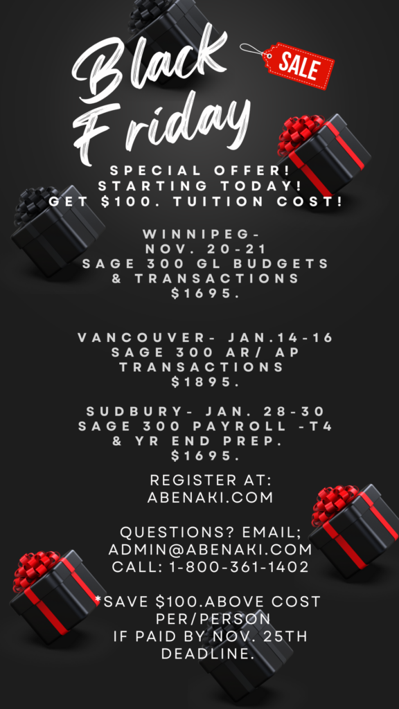 Pre-Black Friday Special! Amy Young November 15, 2024Abenaki News, Black Friday Special, Finance, Sage, Sale, Training Register for online training and Save.